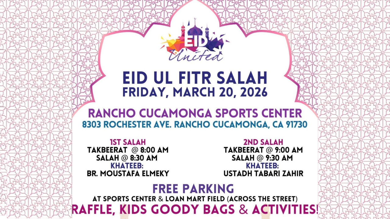 Eid United will host Eid-ul-Fitr prayers on Friday, March 20th at the Rancho Cucamonga Sports Center (Google Maps link), located at 8303 Rochester Avenue, Rancho Cucamonga, CA 91730.